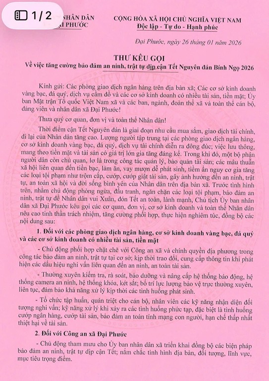 Công an xã Đại Phước tham mưu Chủ tịch UBND xã ban hành Thư kêu gọi tăng cường bảo đảm an ninh, trật tự dịp cận Tết Nguyên đán Bính Ngọ 2026
