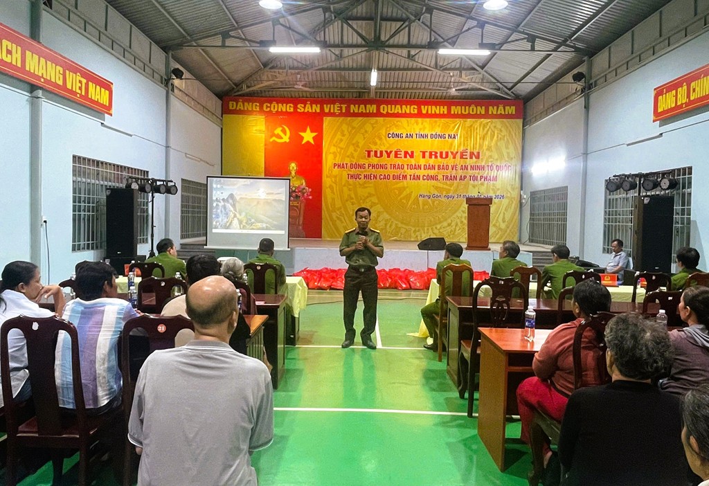 Thực hiện đợt cao điểm tấn công, trấn áp tội phạm, bảo đảm an ninh trật tự phục vụ Đại hội đại biểu toàn quốc lần thứ XIV của Đảng, bầu cử đại biểu Quốc hội khóa XVI và HĐND các cấp nhiệm kỳ 2026–2031, Tết Nguyên đán Bính Ngọ 2026, Công an tỉnh Đồng Nai vừa tổ chức tuyên truyền, phát động phong trào Toàn dân bảo vệ an ninh Tổ quốc trên địa bàn phường Hàng Gòn.