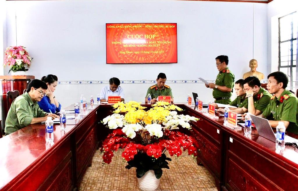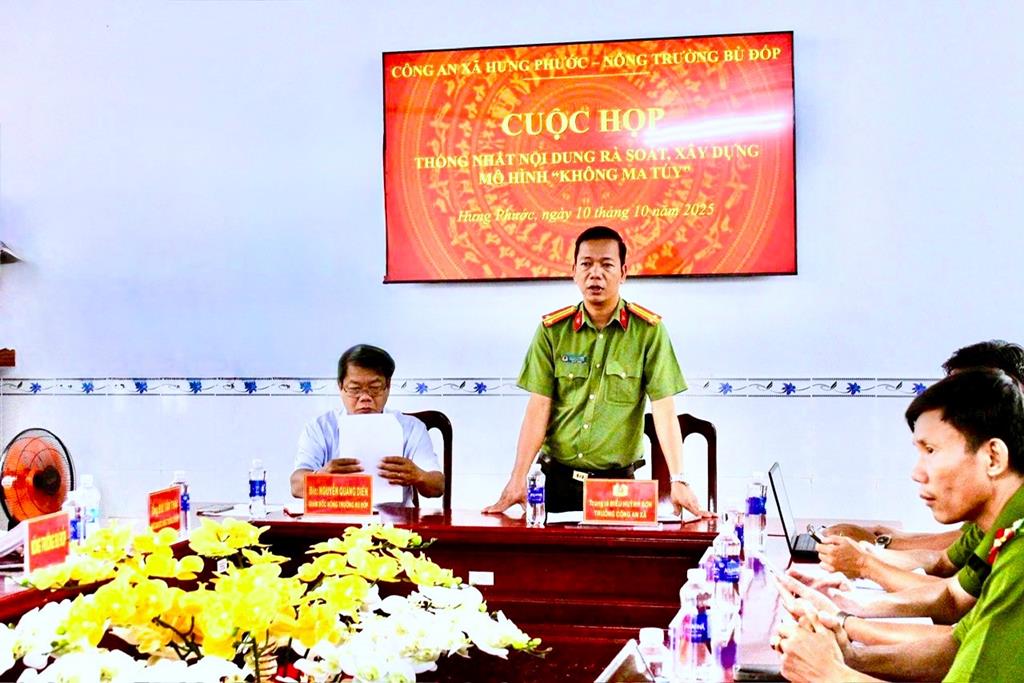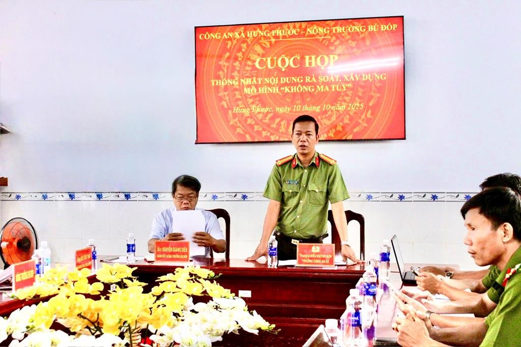 Phát biểu tại cuộc họp, Trung tá Điểu Huỳnh Sơn – Trưởng Công an xã Hưng Phước nhấn mạnh, việc xây dựng mô hình “Công ty, doanh nghiệp không ma túy” là một trong những giải pháp trọng tâm nhằm cụ thể hóa kế hoạch “Xã không ma túy”, góp phần làm trong sạch môi trường lao động, nâng cao nhận thức pháp luật và ý thức tự phòng ngừa trong cán bộ, công nhân viên. Đồng chí khẳng định, Công an xã sẽ thường xuyên đồng hành, hướng dẫn và theo dõi quá trình thực hiện mô hình tại Nông trường, bảo đảm đạt hiệu quả thực chất và bền vững.
