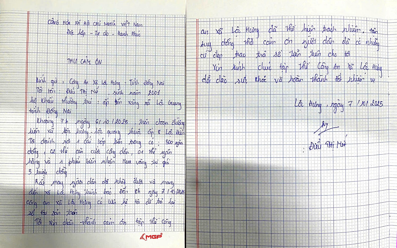Lá thư cảm ơn chị Mít gửi Công an xã Lộc Hưng