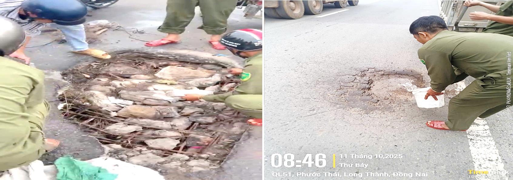 Thiết thực chào mừng kỷ niệm 95 năm Ngày truyền thống công tác Dân vận của Đảng (15/10/1930-15/10/2025) và chào mừng thành công Đại hội Đảng các cấp tiến tới Đại hội lần thứ XIV của Đảng, Công an xã Phước Thái đã phối hợp với Trạm Cảnh sát giao thông đường bộ Ngã ba Thái Lan, Lực lượng tham gia bảo vệ An ninh trật tự ở cơ sở xã Phước Thái cùng với người dân triển khai đắp vá tạm thời các hố sâu trên mặt đường QL51 đoạn qua xã Phước Thái.