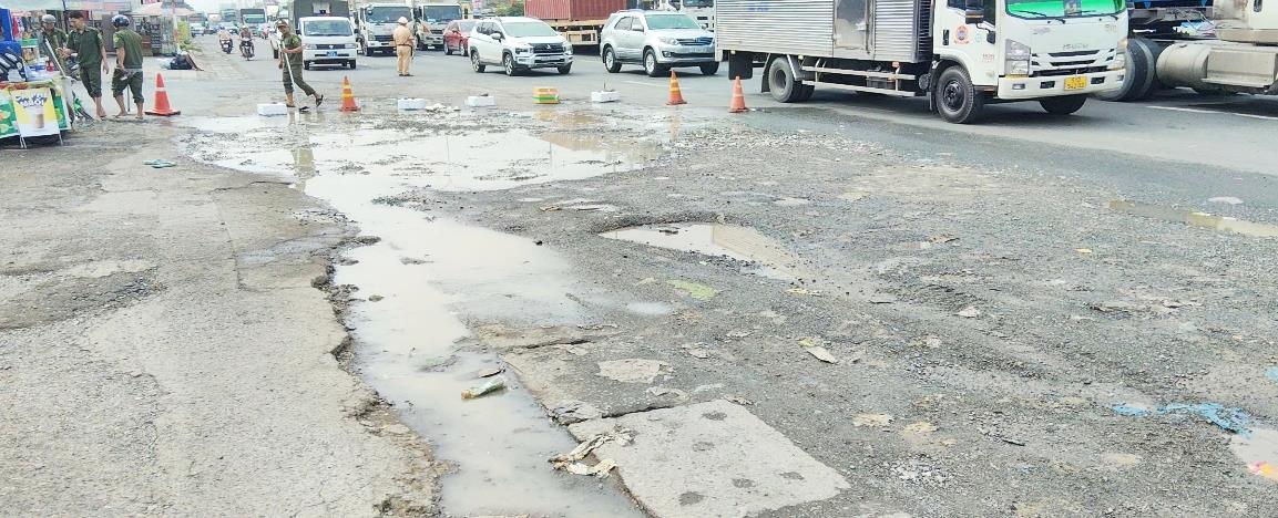 Các hố sâu xuất hiện trên QL51 đoạn qua xã Phước Thái.