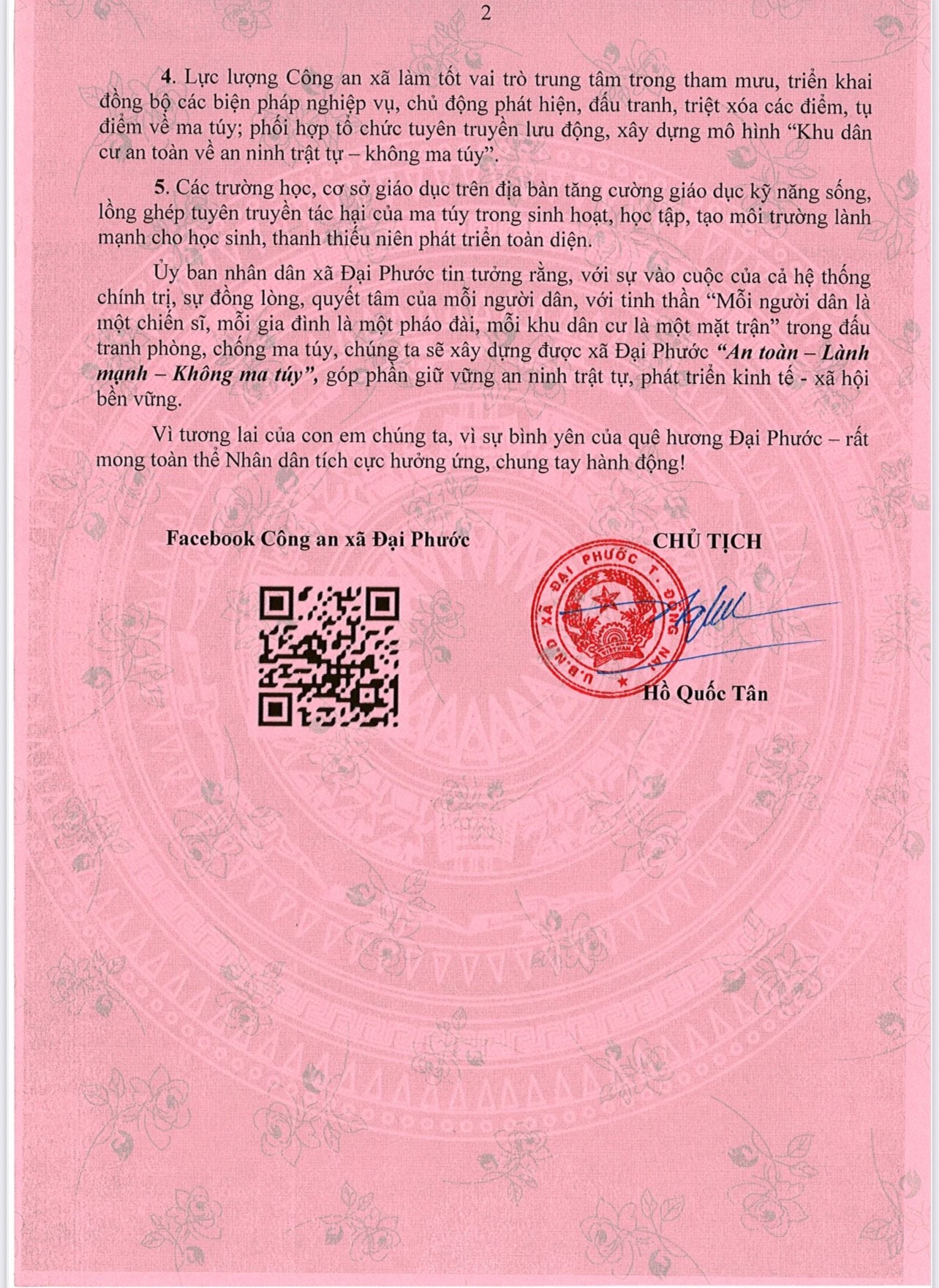 Trong thư, Chủ tịch UBND xã Đại Phước nhấn mạnh: “Ma túy là hiểm họa khôn lường, gây suy thoái giống nòi, phá vỡ hạnh phúc gia đình và làm phát sinh nhiều loại tội phạm nguy hiểm khác. Mỗi cán bộ, đảng viên và người dân cần phát huy tinh thần trách nhiệm, đoàn kết, ý thức ‘tự phòng, tự quản, tự bảo vệ’ để cùng chung tay đẩy lùi tệ nạn này ra khỏi cộng đồng.”