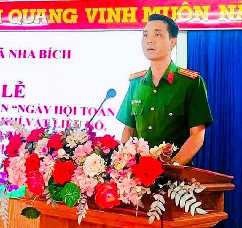 Đồng chí Đinh Huy Phương – Phó Trưởng Công an xã Nha Bích phát biểu tại buổi lễ