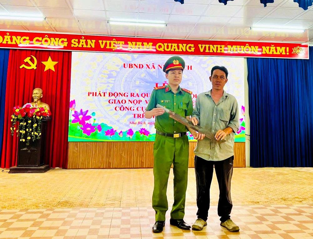 Tại buổi lễ, Công an xã Nha Bích đã tiếp nhận 04 vũ khí thô sơ và 01 súng tự chế do người dân tự nguyện giao nộp.
