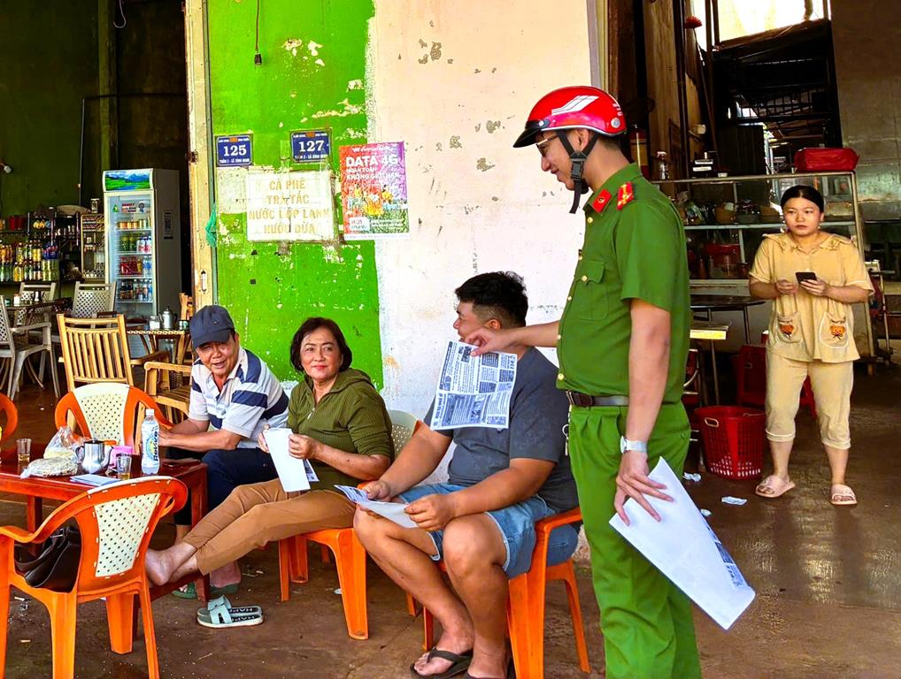 Công an xã phát tờ rơi tuyên truyền về thủ đoạn của tội phạm trộm cắp nông sản mùa cả phê