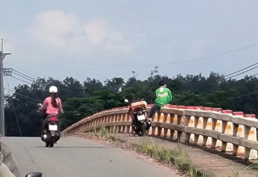 Anh B ngồi trên lan can cầu Nha Bích trước khi được Công an xã giải cứu
