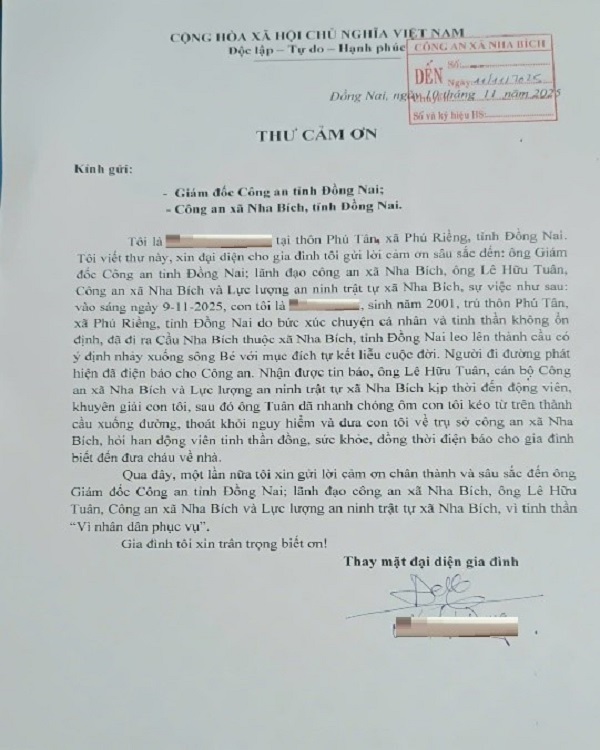 Thư cảm ơn của gia đình anh V.G.B gửi Giám đốc Công an tỉnh và Công an xã Nha Bích