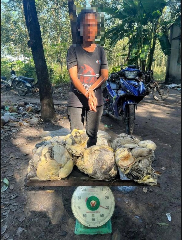 Đối tượng Lương Anh Linh cùng tang vật 31 kg mủ cao su bị thu giữ