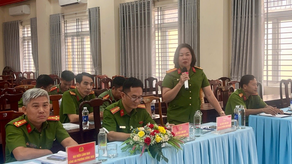 Trung tá Nguyễn Thị Đào, Phó Trưởng Công an phường Chơn Thành phát biểu tại Hội nghị.