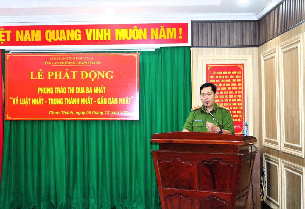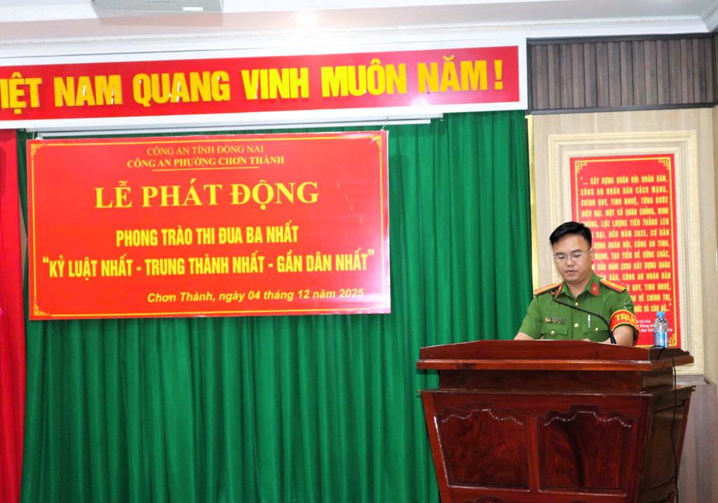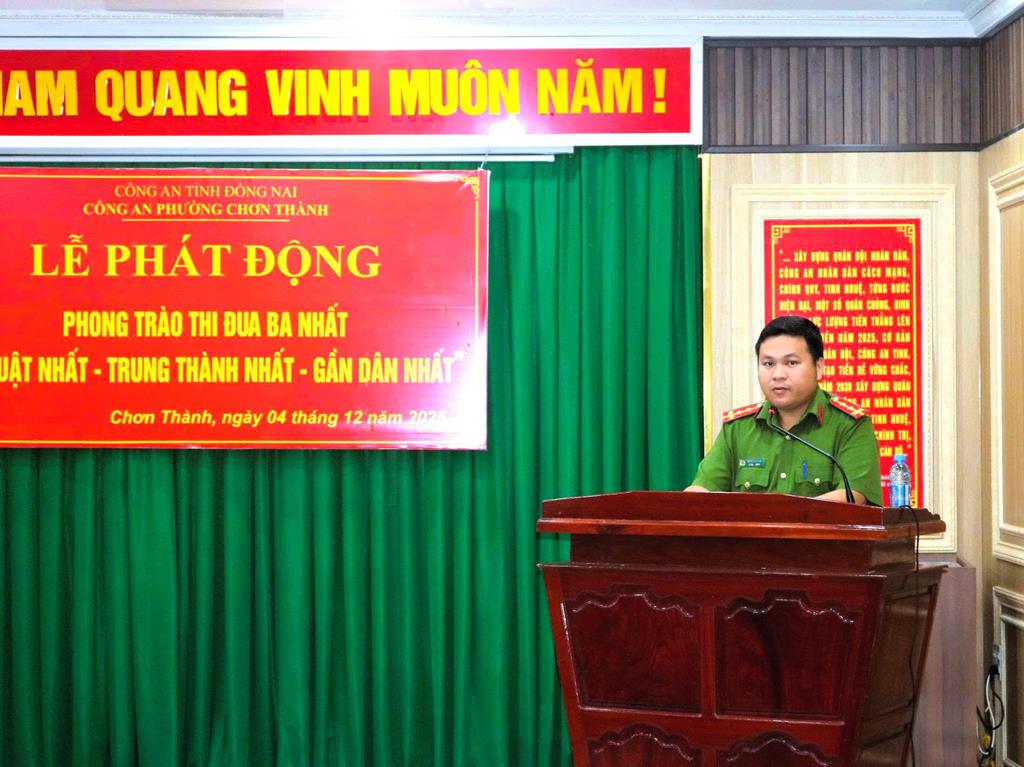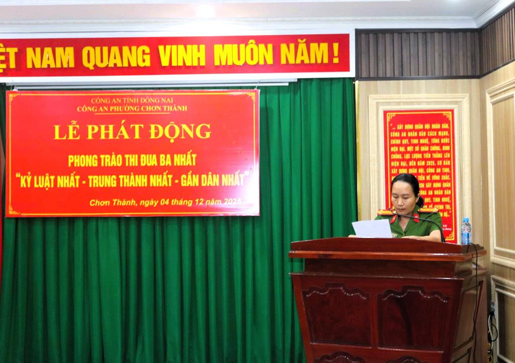 Phát biểu chỉ đạo tại buổi lễ, Trung tá Nguyễn Thị Đào yêu cầu mỗi cán bộ, chiến sĩ phải thực sự gương mẫu, tiên phong trong thực hiện các nội dung thi đua: “kỷ luật nhất”, “trung thành nhất” và “gần dân nhất”. Đồng chí nhấn mạnh, hiệu quả của phong trào phải được đánh giá thông qua mức độ hài lòng, sự tin yêu của nhân dân đối với lực lượng Công an phường Chơn Thành, lấy người dân làm trung tâm trong mọi hoạt động phục vụ.