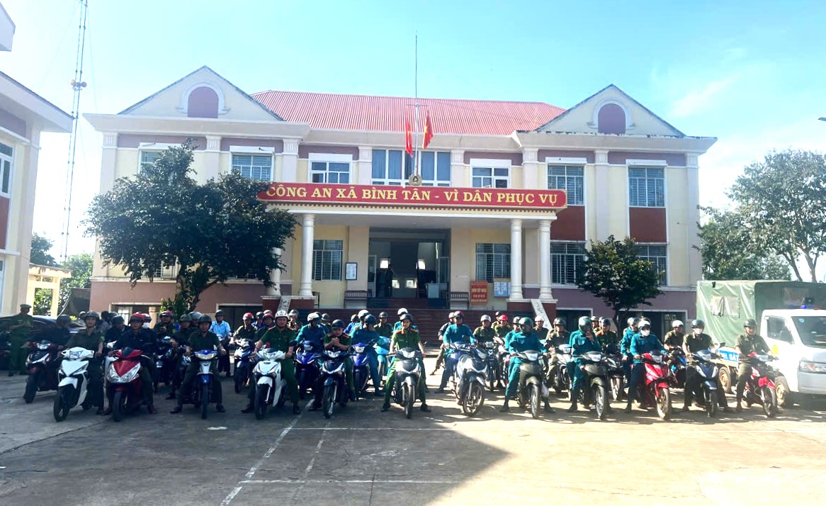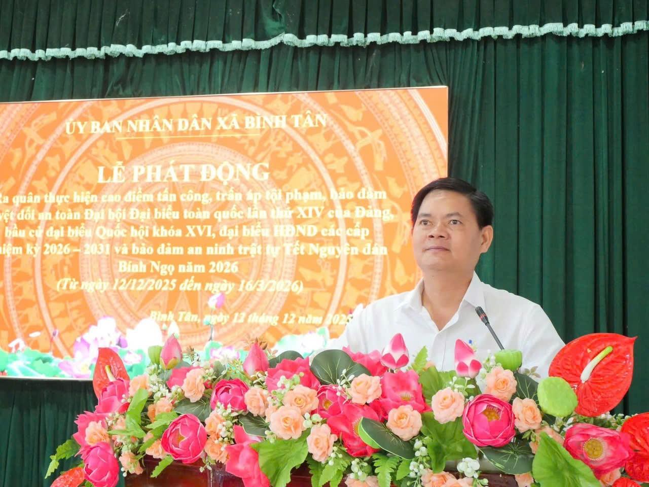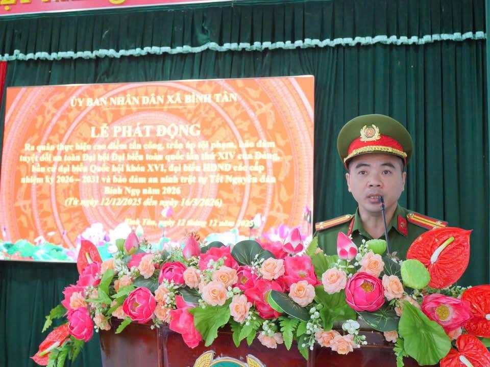 Ngày 12/12/2025, Công an xã Bình Tân đã tham mưu UBND xã tổ chức Lễ ra quân mở đợt cao điểm tấn công, trấn áp tội phạm, bảo đảm an ninh Đại hội đại biểu toàn quốc lần thứ XIV của Đảng; bầu cử Quốc hội khóa XVI, HĐND các cấp nhiệm kỳ 2026-2031 và giữ vững ANTT dịp Tết Nguyên đán Bính Ngọ 2026.