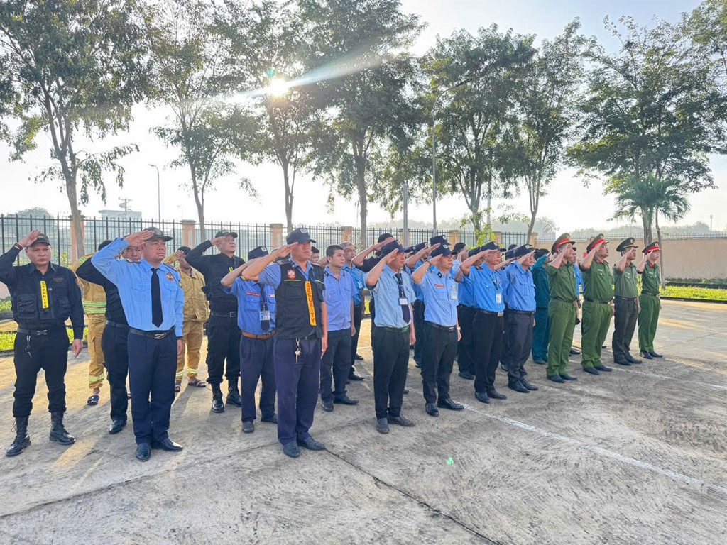 Cán bộ, chiến sĩ và đại diện các Tổ bảo vệ Khu công nghiệp Minh Hưng thực hiện nghi lễ chào cờ trước khi ra quân