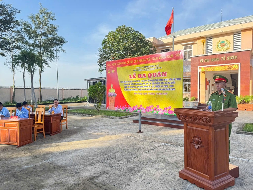 Phát biểu tại buổi lễ, đồng chí Nguyễn Thanh Hải quán triệt ý nghĩa, tầm quan trọng của đợt cao điểm trong công tác bảo đảm an ninh, trật tự phục vụ Đại hội đại biểu toàn quốc lần thứ XIV của Đảng, bầu cử đại biểu Quốc hội khóa XVI, đại biểu HĐND các cấp nhiệm kỳ 2026–2031 và Tết Nguyên đán Bính Ngọ 2026. Trưởng Đồn Công an KCN Minh Hưng yêu cầu toàn lực lượng nêu cao tinh thần trách nhiệm, tập trung thực hiện nghiêm các nhiệm vụ trọng tâm.