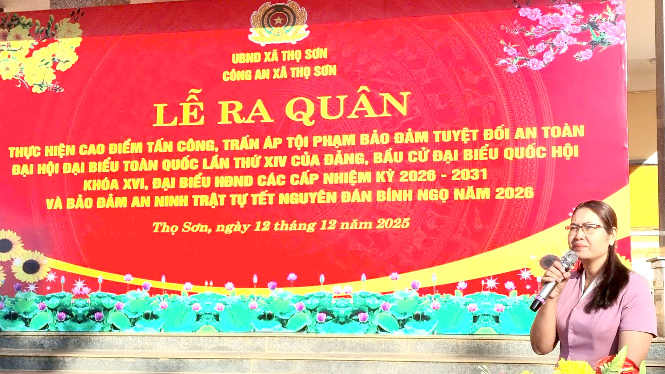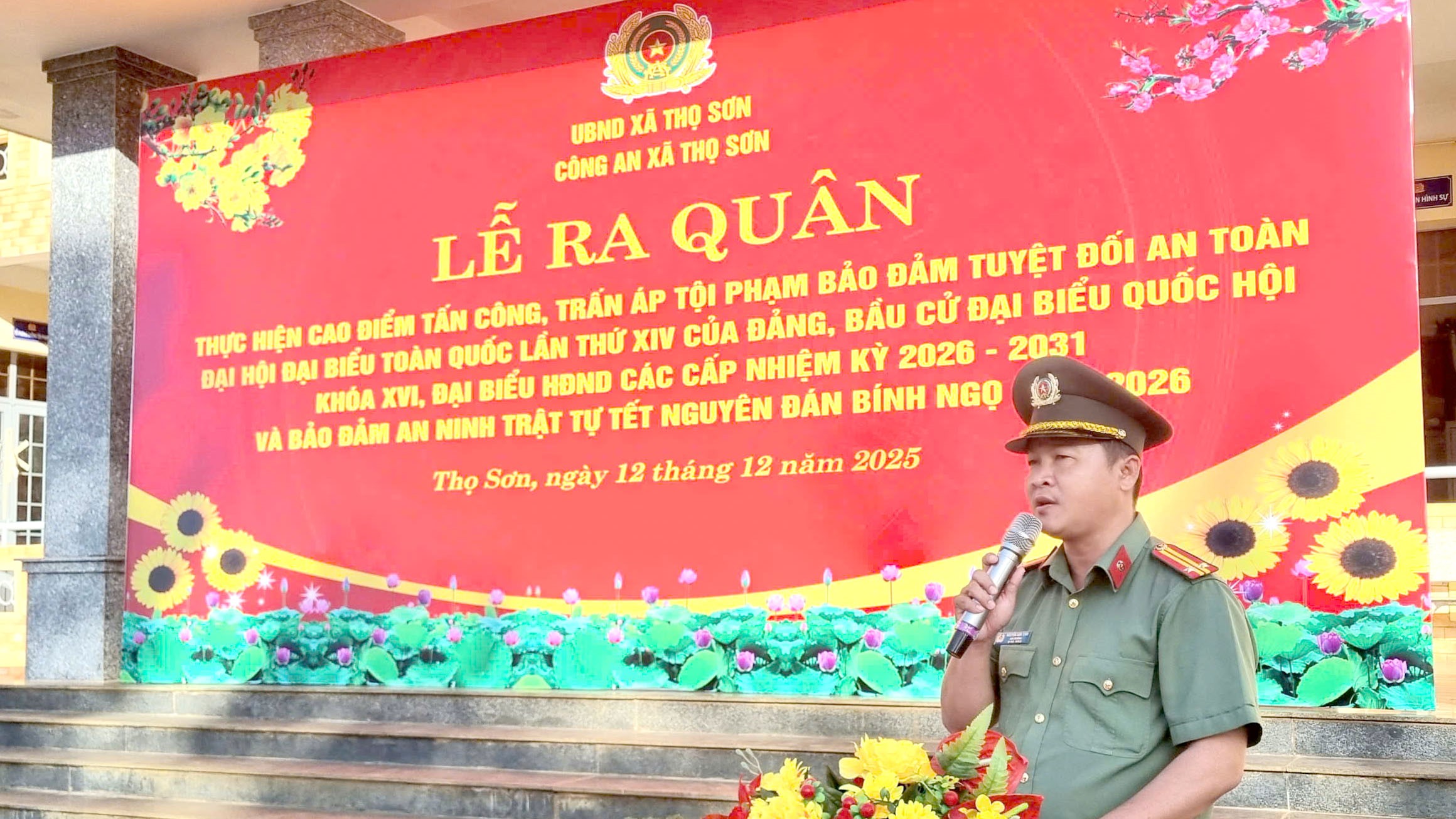Tại Lễ phát động, đồng chí Phó Chủ tịch UBND xã nhấn mạnh: Thọ Sơn là địa bàn giáp ranh với tỉnh Lâm Đồng, là xã miền núi, có đông đồng bào các dân tộc thiểu số cùng sinh sống, Công an xã phải tập trung triển khai thực hiện quyết liệt, đồng bộ các biện pháp nắm chắc tình hình trong dân tộc, tôn giáo, an ninh nông thôn nhằm phòng ngừa, phát hiện, ngăn chặn không để xảy ra các hoạt động xâm phạm ANQG; tuyên truyền, lôi kéo, kích động, xuyên tạc chống phá Đảng, Nhà nước trên mạng xã hội; tăng cường quản lý hoạt động của người nước ngoài đến lưu trú làm ăn kinh tế trên địa bàn; phát hiện, đấu tranh, xử lý nghiêm các hành vi khai thác, vận chuyển khoán sản trái phép; tăng cường đấu tranh, trấn áp mạnh mẽ các loại tội phạm, tệ nạn xã hội và các hành vi vi phạm pháp luật khác; làm tốt công tác dân vận, chủ động nắm chắc tình hình, sẵn sàng xử lý kịp thời các tình huống khi mới phát sinh, không để bị động, bất ngờ tạo điều kiện tốt nhất để phát triển kinh tế, văn hoá, xã hội địa phương; bảo đảm cho Nhân dân vui xuân, đón Tết bình yên, an toàn.