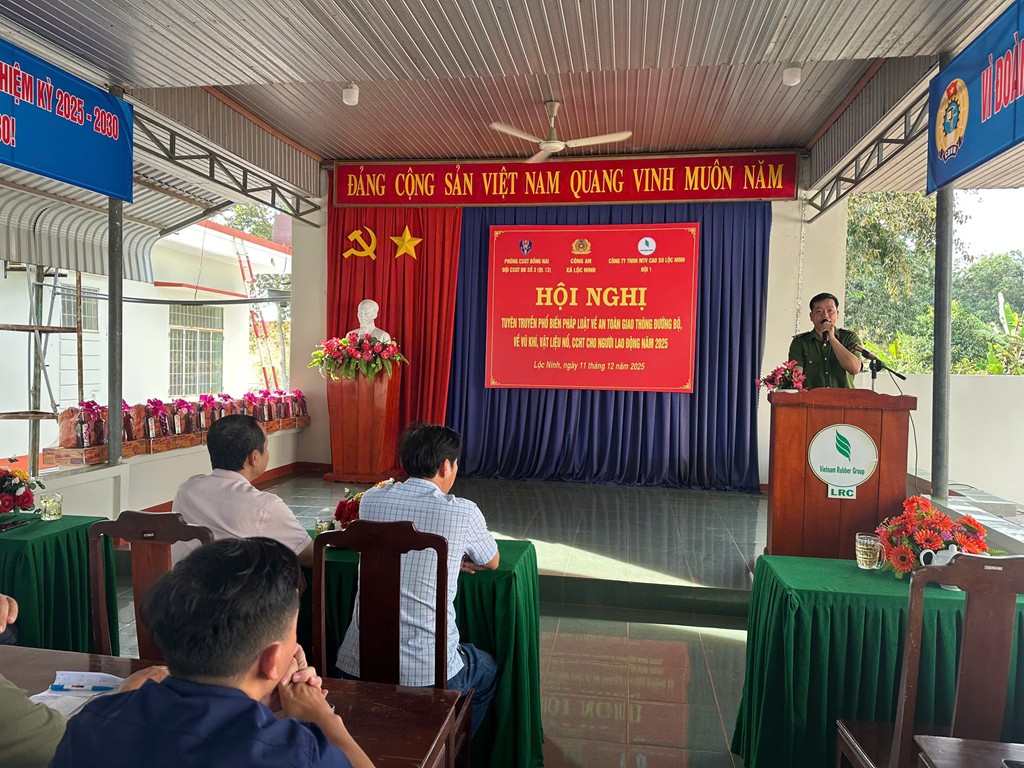 Ngày 11/12 tại Đội 1 thuộc Công ty TNHH cao su Lộc Ninh, Công an xã Lộc Ninh phối hợp với Công ty TNHH MTV cao su Lộc Ninh và Đội CSGT đường bộ số 3 (PC08) tuyên truyền, phổ biến pháp luật phòng ngừa các vi phạm về vũ khí, vật liệu nổ, công cụ hỗ trợ và pháo. Thông tin đến nhân dân tình hình liên quan đến các hành vi vận chuyển, tàng trữ, sử dụng trái phép các loại pháo nổ trên địa bàn, nhất là tác hại hành vi sử dụng pháo nổ trong thời gian gần cận tết Nguyên đán 2026; phổ biến các hành vi nghiêm cấm sử dụng vũ khí, vật liệu nổ, công cụ hỗ trợ. Đồng thời tuyên truyền, vận động người dân tích cực tham gia giao nộp vũ khí, vật liệu nổ, công cụ hỗ trợ và pháo.