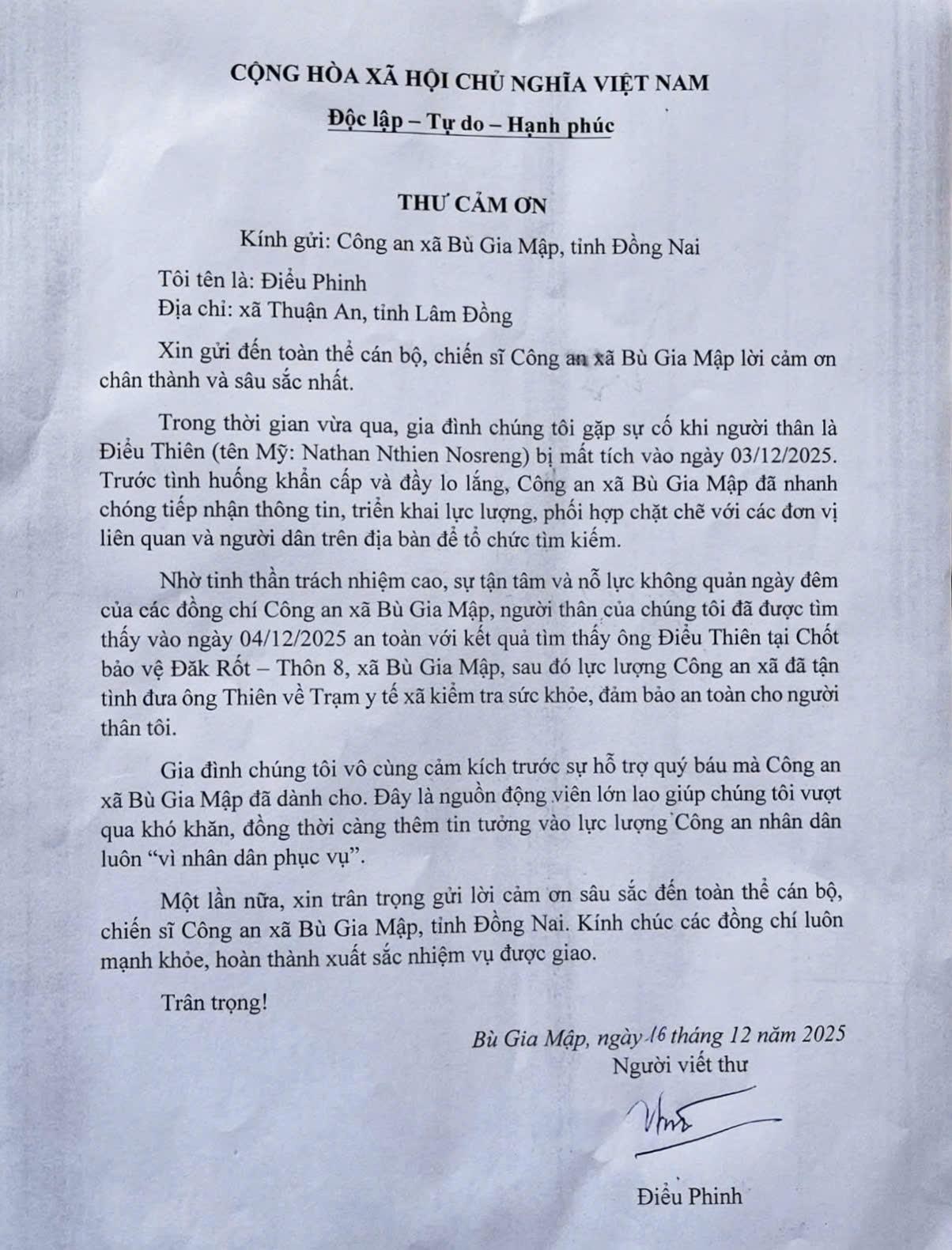 Bức thư cảm ơn của ông Điểu Phinh gửi Công an xã Bù Gia Mập