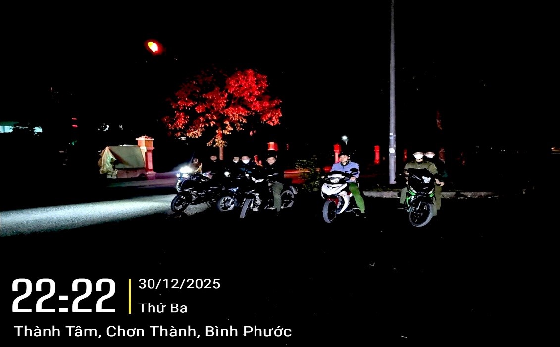 Công an phường Chơn Thành tiếp tục duy trì, tăng cường công tác tuần tra, kiểm soát trong thời gian cao điểm cuối năm, tập trung vào các tuyến đường, khu vực công cộng, nhất là trong khung giờ đêm khuya, rạng sáng – thời điểm mà các đối tượng thường lợi dụng sơ hở của người dân để hoạt động phạm pháp.