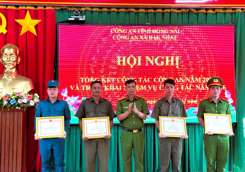 Đại diện Ban Chỉ huy Công an xã thừa ủy quyền của Chủ tịch UBND xã trao giấy khen cho các cá nhân đã có thành tích xuất sắc trong công tác đấu tranh PCTP năm 2025