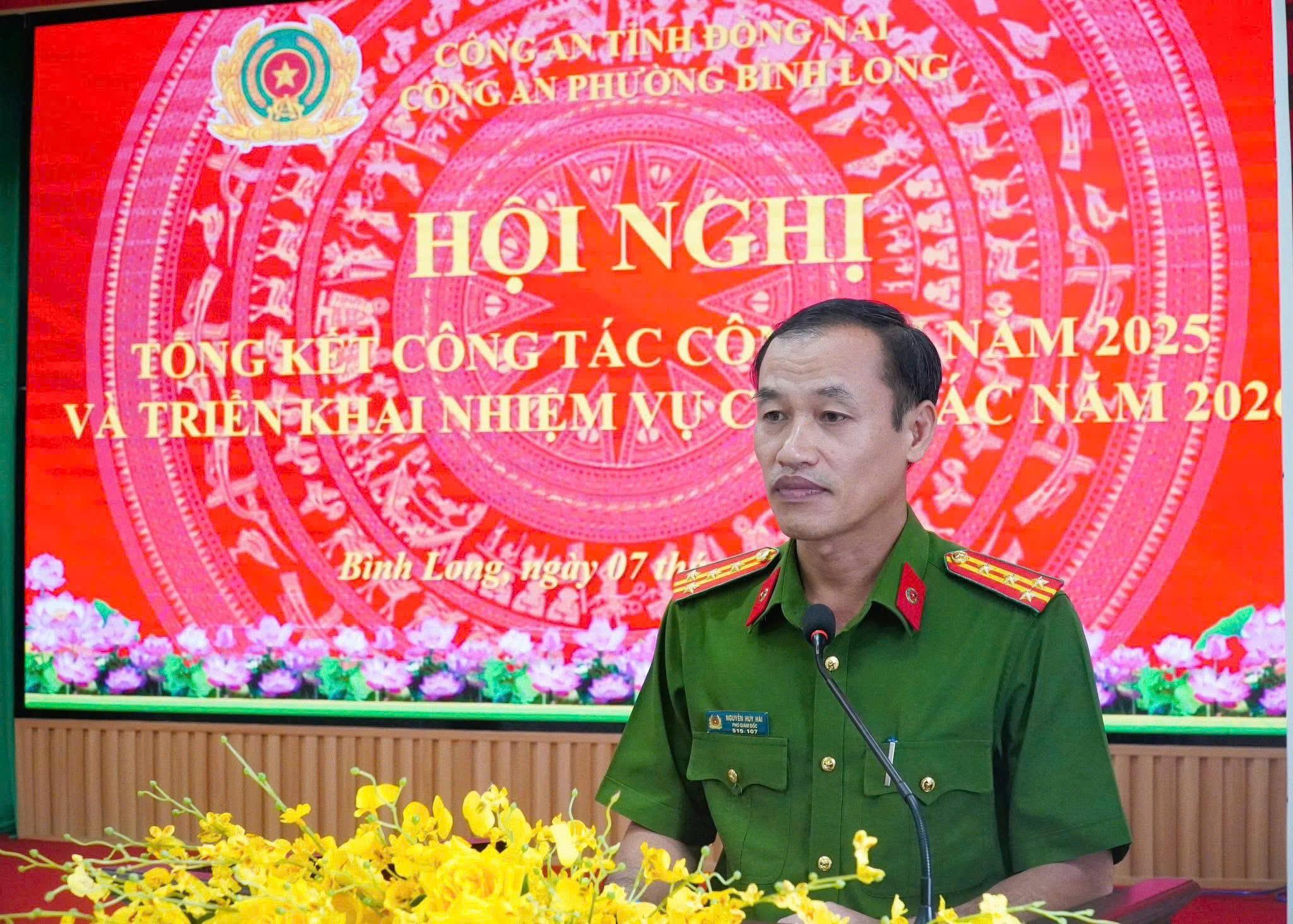 Phát biểu tại Hội nghị, Đồng chí Phó Giám đốc yêu cầu Công an Phường Bình Long phát huy những kết quả đạt được trong năm để tiếp tục thực hiện nhiệm vụ theo tư duy mới, góp phần kiến tạo phát triển kinh tế - xã hội của địa phương; chủ động nắm chắc tình hình, bảo đảm an ninh chủ động; kịp thời tham mưu cấp ủy, chính quyền địa phương giải quyết các vụ việc phức tạp, không để hình thành điểm nóng về an ninh, trật tự…. Đồng thời, bảo đảm an ninh, an toàn tuyệt đối Đại hội đại biểu toàn quốc lần thứ XIV của Đảng, bầu cử đại biểu Quốc hội khóa XVI và đại biểu HĐND các cấp nhiệm kỳ 2026–2031; nâng cao chất lượng công tác nghiệp vụ, siết chặt kỷ luật, kỷ cương, xây dựng lực lượng Công an xã ngày càng chính quy, tinh nhuệ, đáp ứng yêu cầu nhiệm vụ trong giai đoạn mới.