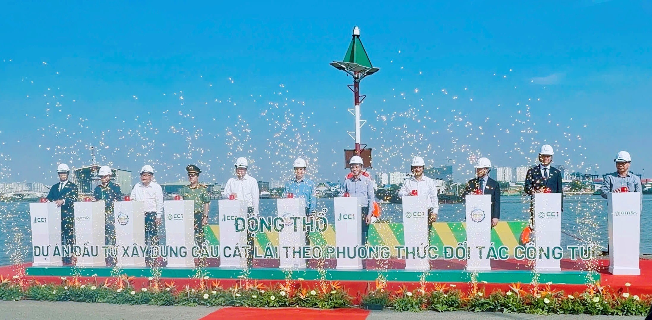 Các đồng chí lãnh đạo và đại biểu bấm nút động thổ dự án đầu tư xây dựng cầu Cát Lái