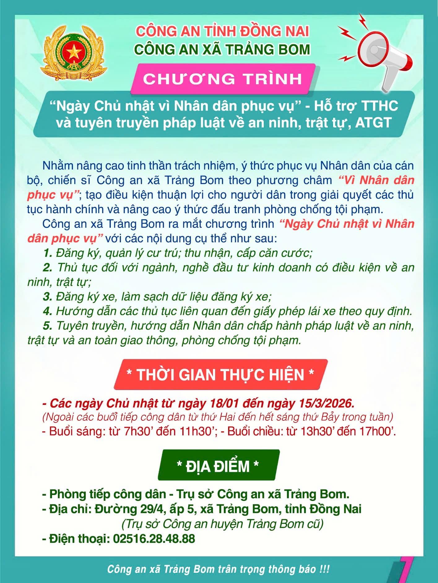 Trong khuôn khổ chương trình, Công an xã Trảng Bom bố trí lực lượng trực tiếp tiếp nhận, hướng dẫn, giải quyết các thủ tục hành chính cho Nhân dân vào ngày chủ nhật, tập trung vào các lĩnh vực cư trú, căn cước, đăng ký xe, giấy phép lái xe và ngành nghề đầu tư kinh doanh có điều kiện về an ninh, trật tự; đồng thời đẩy mạnh tuyên truyền, hướng dẫn, hạn chế việc đi lại nhiều lần của người dân.