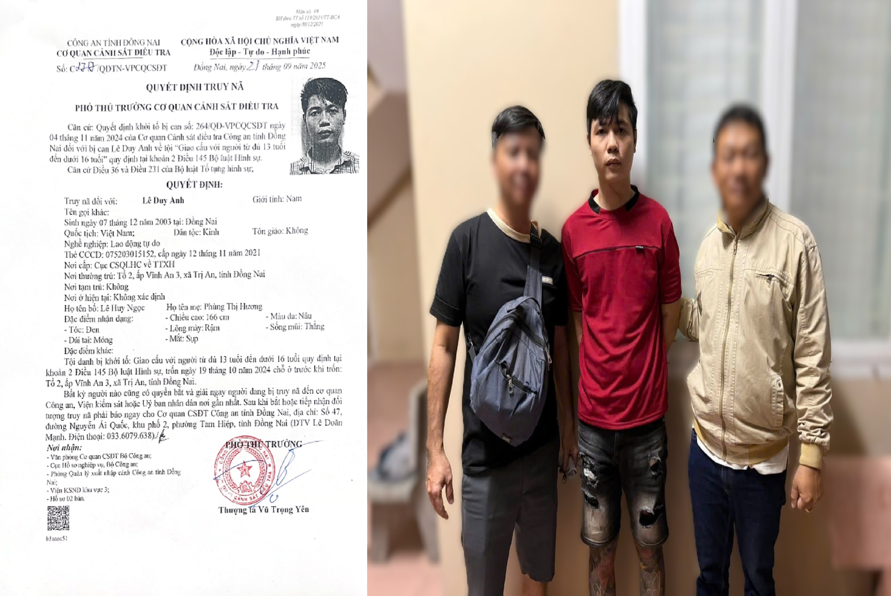 Theo hồ sơ vụ án, Lê Duy Anh (SN 2003, ngụ tại ấp Vĩnh An 3, xã Trị An, tỉnh Đồng Nai) là đối tượng bị Cơ quan Cảnh sát điều tra (CSĐT) Công an tỉnh Đồng Nai ra Quyết định truy nã ngày 23/9/2025 về hành vi "Giao cấu với người từ đủ 13 tuổi đến dưới 16 tuổi".