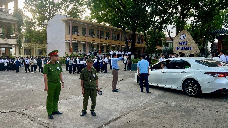 Song song với công tác bảo vệ ANTT, lực lượng Công an phường còn phối hợp phân luồng, điều tiết giao thông trước cổng trường và trên các tuyến đường xung quanh khu vực thi; bảo đảm trật tự an toàn, tạo điều kiện thuận lợi để thí sinh và phụ huynh di chuyển an toàn, đúng giờ.