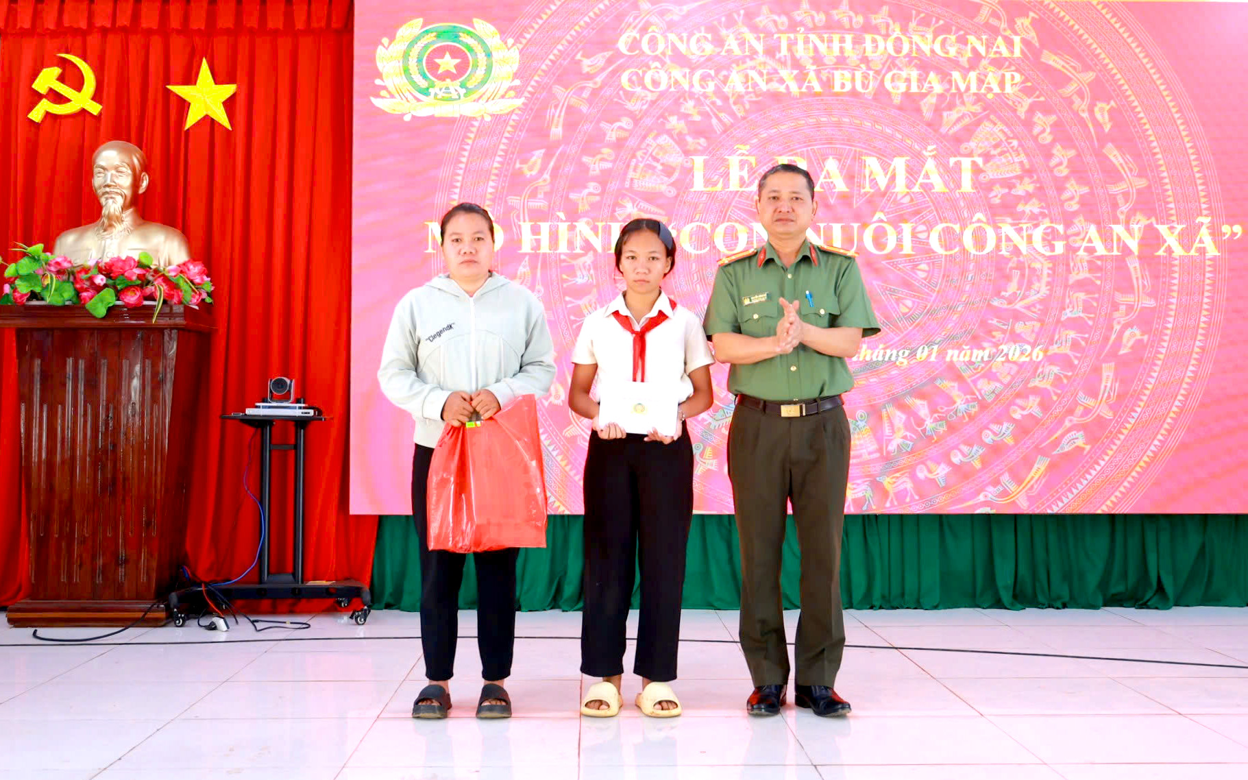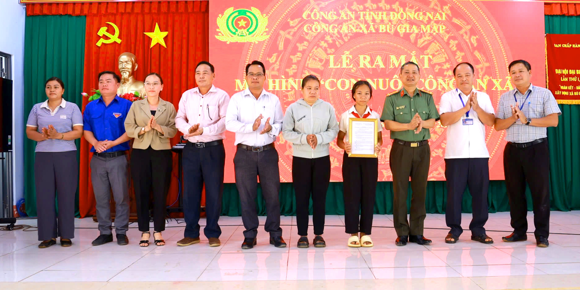 Tại buổi Lễ, Công an xã Bù Gia Mập đã công bố quyết định triển khai mô hình “Con nuôi Công an xã” đối với em Điểu Thị Mận, SN 2012, học sinh lớp 8A4 Trường THCS & THPT Đăk Mai, thường trú tại thôn Bù Dốt, xã Bù Gia Mập. Hoàn cảnh của em Mận là đặc biệt khó khăn, mồ côi cả cha lẫn mẹ, hiện em đang sống cùng bà con. Công an xã Bù Gia Mập sẽ hỗ trợ và đồng hành lâu dài cùng em Mận trong học tập, sinh hoạt và có định hướng tương lai cho em; Kinh phí Công an xã Bù Gia Mập hỗ trợ hằng tháng cho Mận tối thiểu là 1.000.000 đồng. Gia đình anh Lê Đức Lâm và chị Ngô Thị Thu Thủy ủng hộ 2.000.000 đồng, đồng thời sẽ thường xuyên quan tâm, động viên, giáo dục đạo đức, lối sống và kỹ năng xã hội cho em Mận.