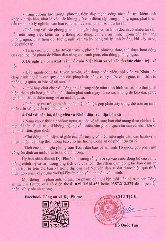 Thông qua Thư kêu gọi, Công an xã Đại Phước cũng khuyến cáo cán bộ, đảng viên và Nhân dân nâng cao ý thức tự phòng ngừa; hạn chế mang theo nhiều tiền mặt, tài sản có giá trị lớn khi không thật sự cần thiết; chủ động phát hiện, tố giác các hành vi vi phạm pháp luật; tích cực tham gia phong trào “Toàn dân bảo vệ an ninh Tổ quốc”, góp phần xây dựng thế trận an ninh nhân dân vững chắc ngay từ cơ sở.