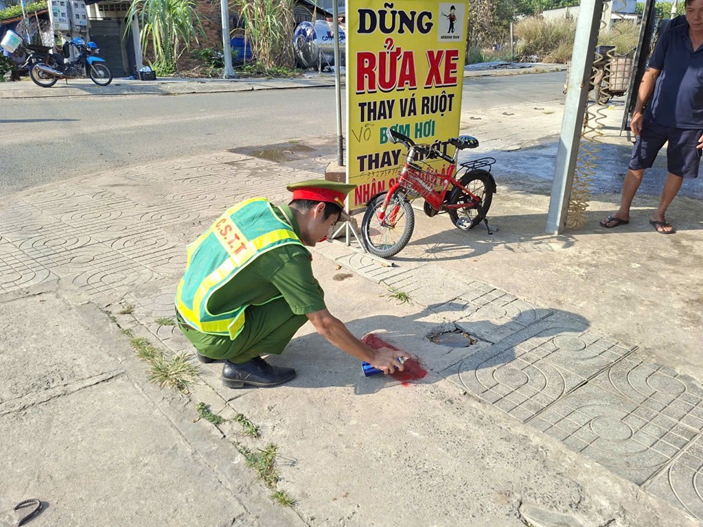 Cán bộ Công an phường tiến hành sơn, đánh dấu vị trí vi phạm trên vỉa hè