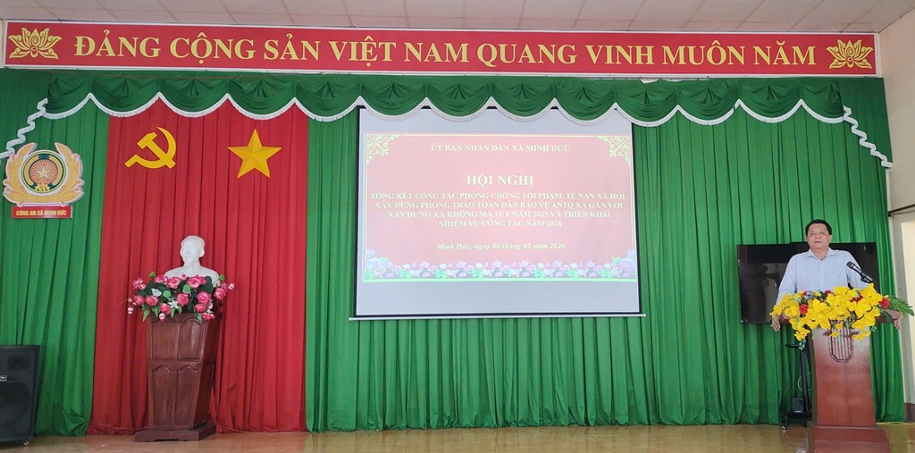 Phát biểu kết luận Hội nghị, đồng chí Chủ tịch UBND xã Minh Đức ghi nhận và biểu dương những nỗ lực, kết quả đạt được của các ban, ngành, đoàn thể, các ấp, sóc và Nhân dân trên địa bàn; nhấn mạnh vai trò tham mưu, tổ chức thực hiện hiệu quả của Công an xã Minh Đức trong công tác bảo đảm an ninh, trật tự. Đồng chí yêu cầu thời gian tới, Công an xã tiếp tục phát huy vai trò nòng cốt, chủ động tham mưu cấp ủy, chính quyền triển khai các giải pháp phòng ngừa xã hội gắn với phòng ngừa nghiệp vụ; các ban, ngành, đoàn thể và Trưởng các ấp, sóc tăng cường phối hợp, phát huy sức mạnh tổng hợp của cả hệ thống chính trị và Nhân dân trong xây dựng phong trào toàn dân bảo vệ ANTQ; quyết tâm giữ vững ổn định an ninh, trật tự và duy trì xã Minh Đức là xã không ma túy trong năm 2026.