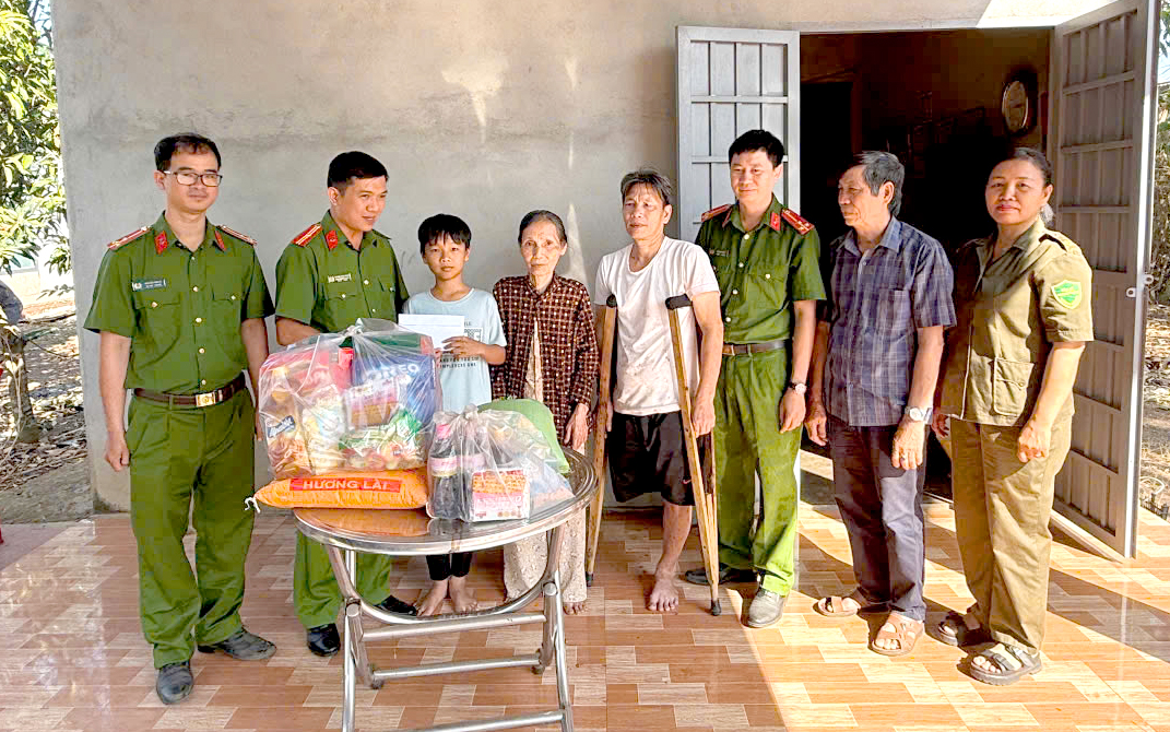 Công an xã Long Hà và cán bộ khu dân cư đến thăm, chúc Tết và tặng quà cho em Thắng cùng gia đình.