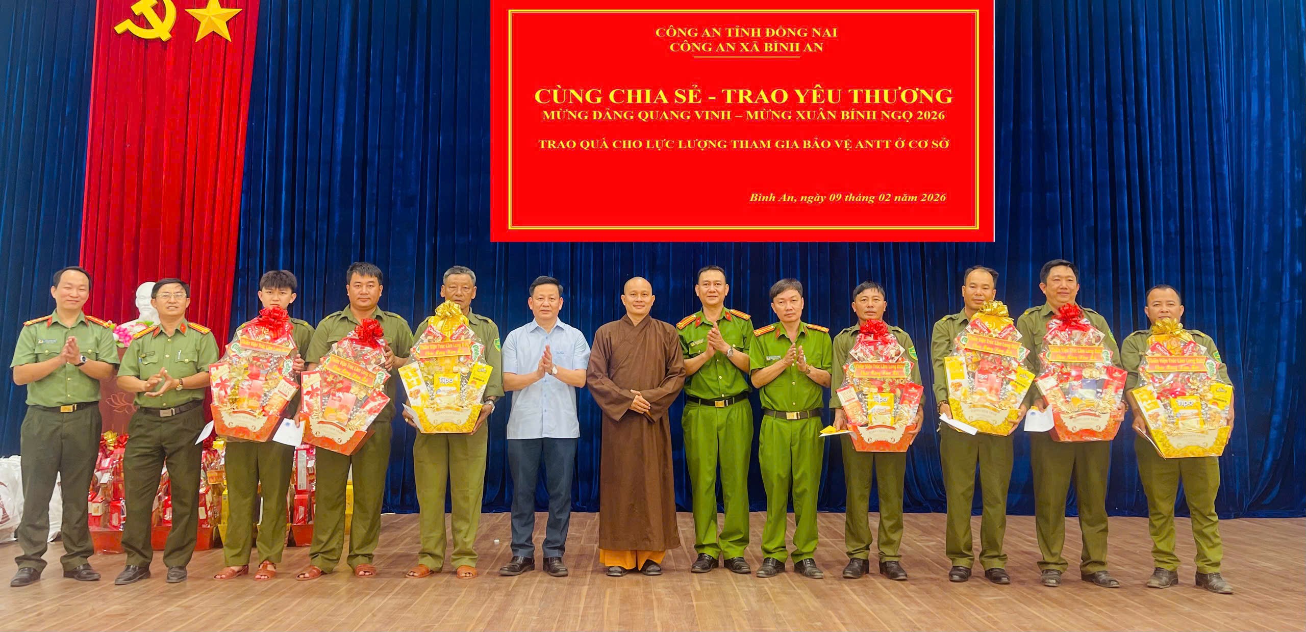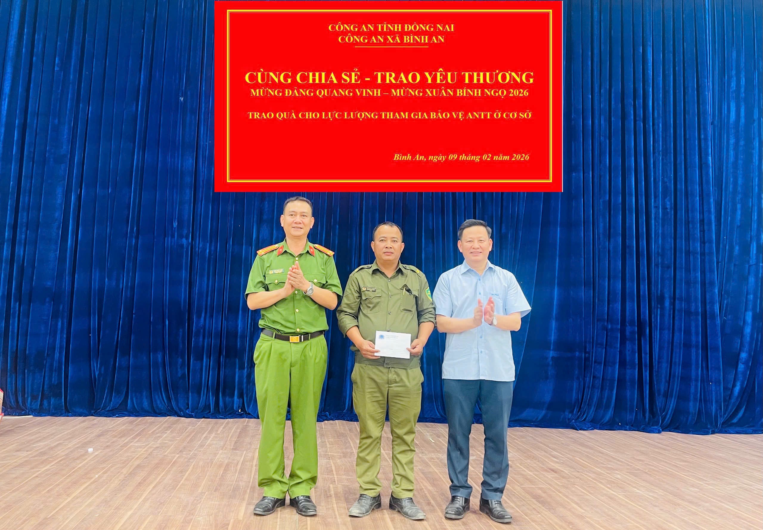 Phát huy truyền thống “tương thân tương ái” tốt đẹp của dân tộc Việt Nam, trong những ngày giáp Tết Nguyên đán Bính Ngọ 2026, chiều ngày 9/2/2026, Công an xã Bình An tổ chức chương trình “Cùng chia sẻ - Trao yêu thương” – Mừng Đảng quang vinh – Mừng Xuân Bính Ngọ 2026, góp phần chăm lo Tết cho lực lượng tham gia bảo vệ an ninh, trật tự ở cơ sở, để mọi người đều được đón Xuân ấm áp, nghĩa tình.