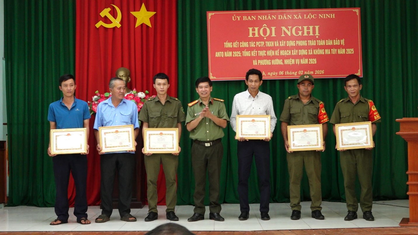 Tại Hội nghị, 8 cá nhân có thành tích xuất sắc trong thực hiện Ngày hội toàn dân giao nộp vũ khí, vật liệu nổ, công cụ hỗ trợ và pháo trong năm 2025 được Chủ tịch ủy ban nhân dân xã Lộc Ninh khen thưởng.
