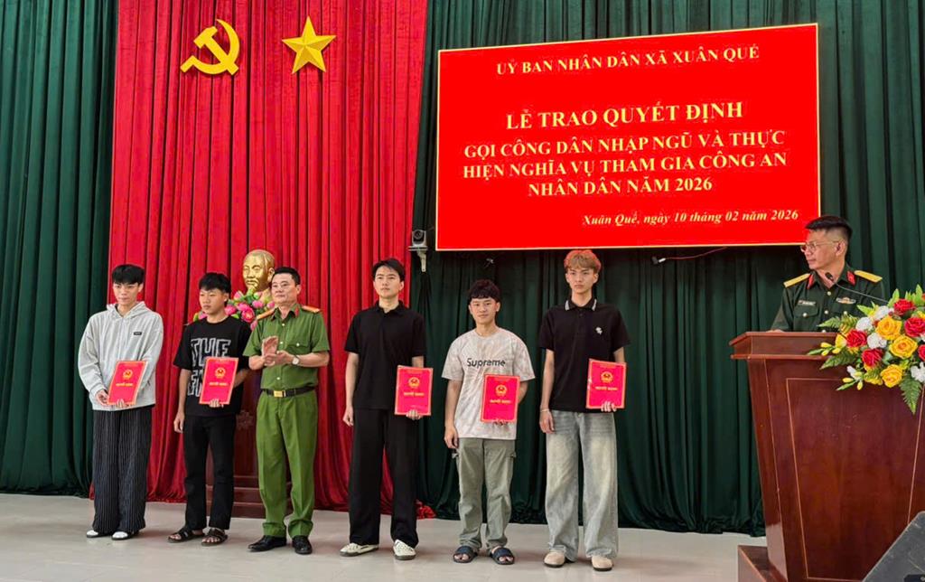 Tại buổi lễ, Trung tá Phạm Đăng Tuấn – Trưởng Công an xã Xuân Quế đã trao Quyết định thực hiện nghĩa vụ tham gia Công an nhân dân cho 06 công dân. Đây là những công dân tiêu biểu, đáp ứng đầy đủ các tiêu chuẩn theo quy định, thể hiện tinh thần tự giác, sẵn sàng cống hiến sức trẻ cho sự nghiệp bảo vệ an ninh quốc gia, giữ gìn trật tự, an toàn xã hội. Năm 2026, Công an xã Xuân Quế tuyển chon 06 công dân, trong đó có 03 công dân có trình độ đại học, 01 công dân có trình độ Cao đẳng và 02 công dân có học vấn THPT.