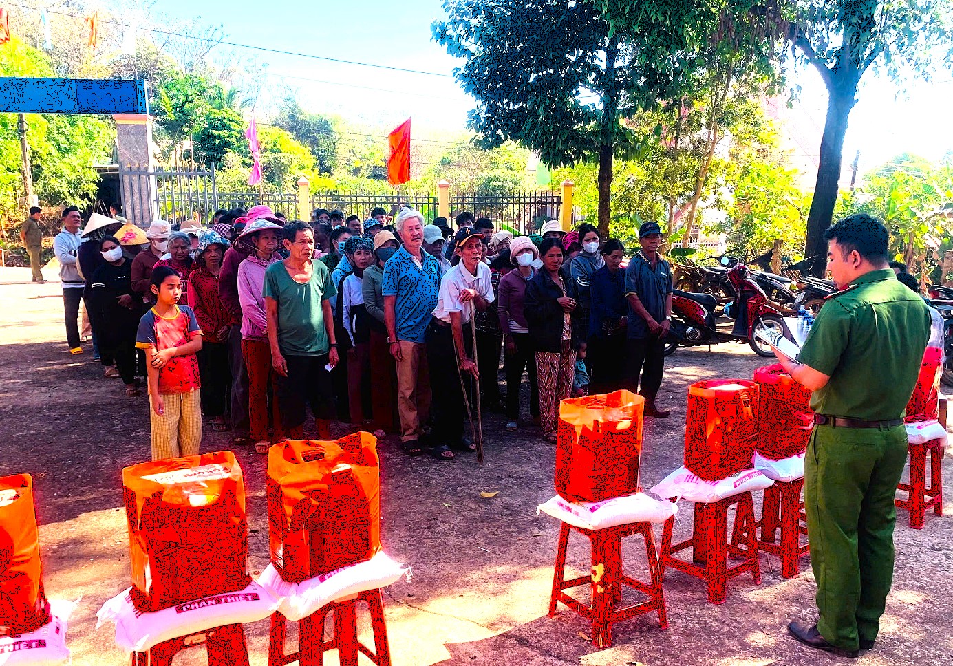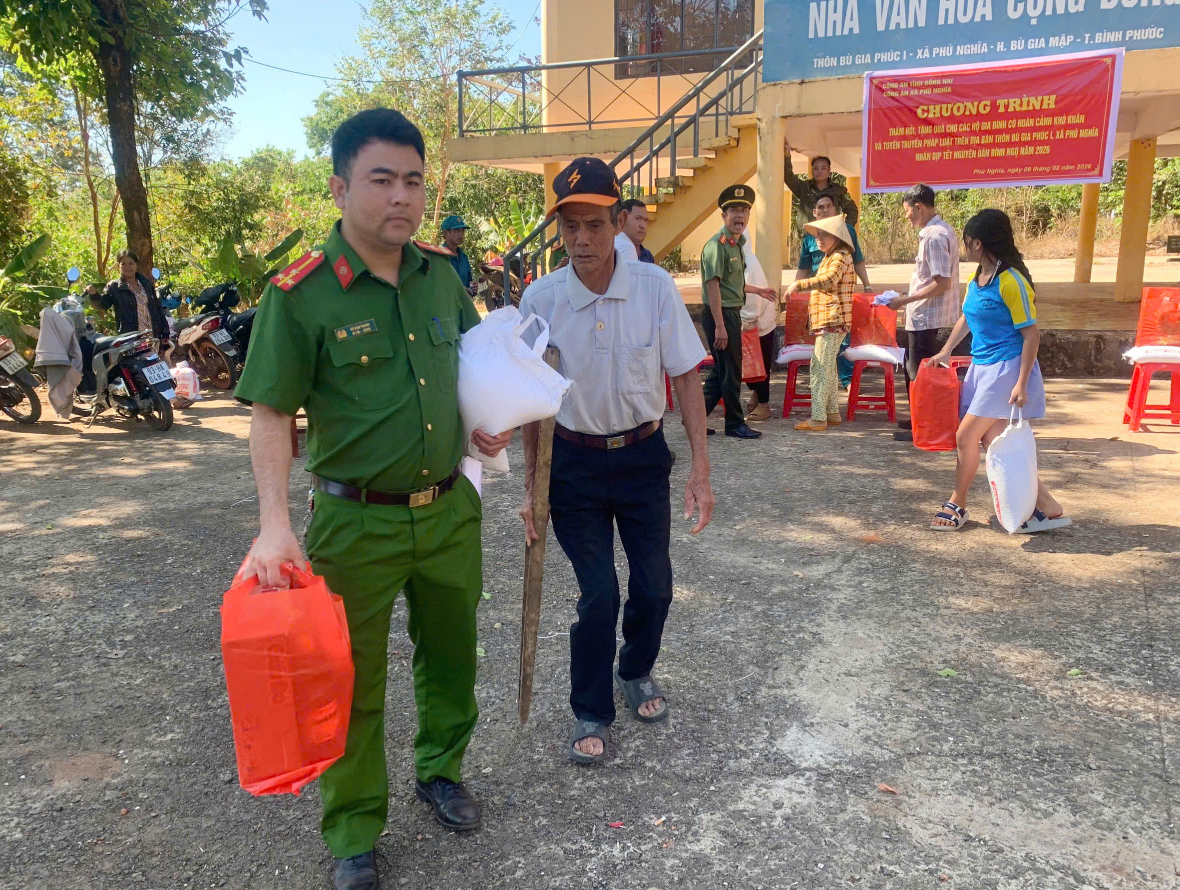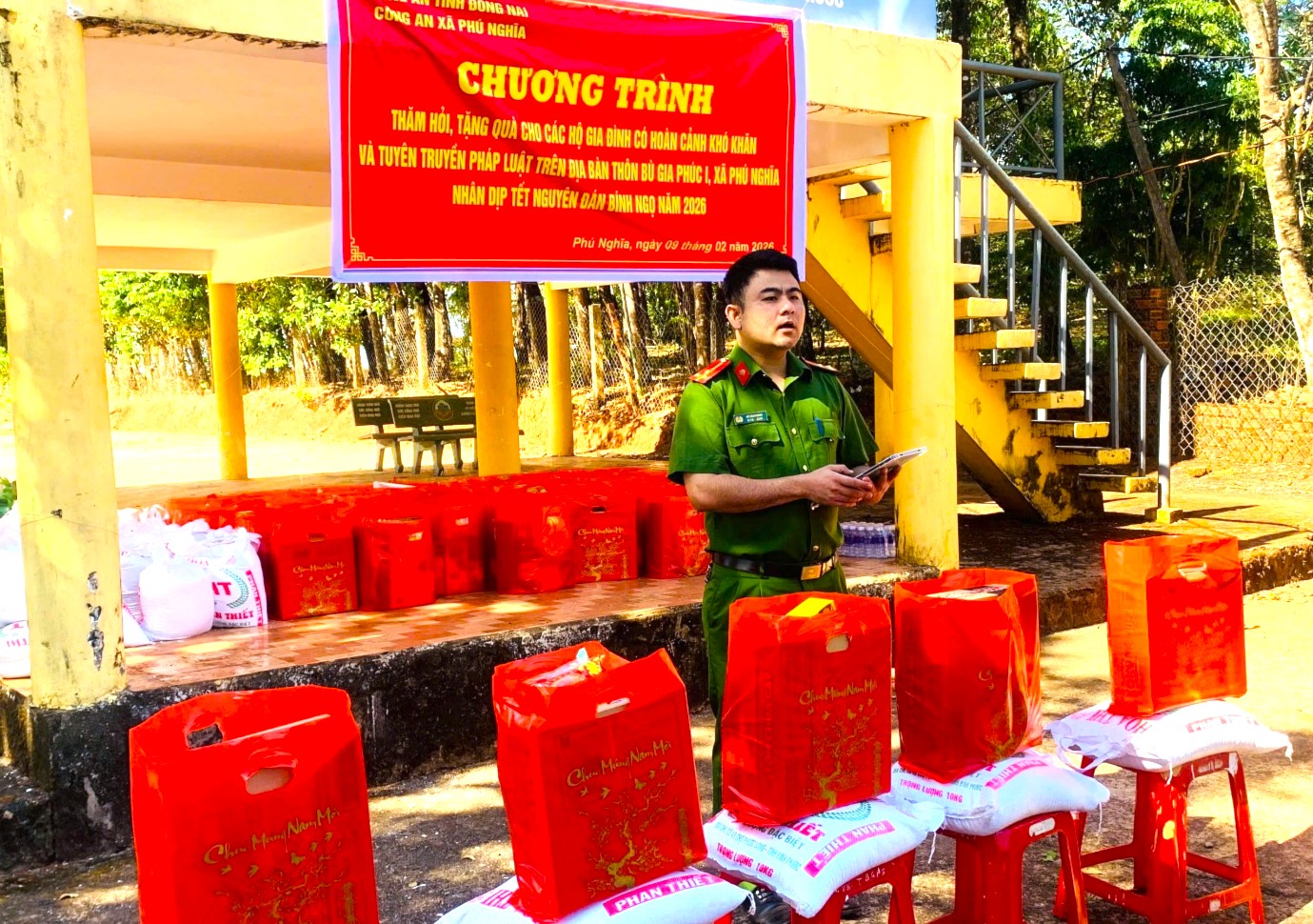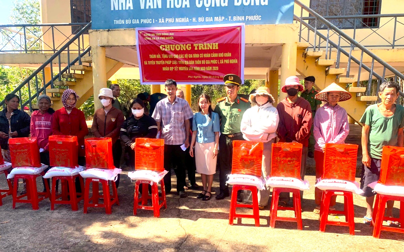 Nhân dịp này, Công an xã Phú Nghĩa đã tặng 80 phần quà cho các hộ dân có hoàn cảnh khó khăn tại thôn Bù Gia Phúc 1, với tổng giá trị 40.000.000 đồng. Bên cạnh việc trao tặng quà, lãnh đạo và cán bộ Công an xã đã ân cần thăm hỏi, động viên và gửi lời chúc Tết tới bà con Nhân dân, mong muốn các gia đình đón Tết cổ truyền đầm ấm, vui tươi và an toàn.