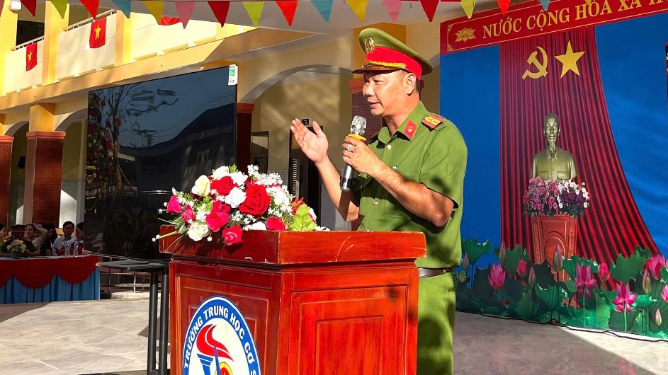 Cán bộ, Công an phường Đồng Xoài tuyên truyền, phổ biến pháp luật cho học sinh Trường THCS Tiến Thành.