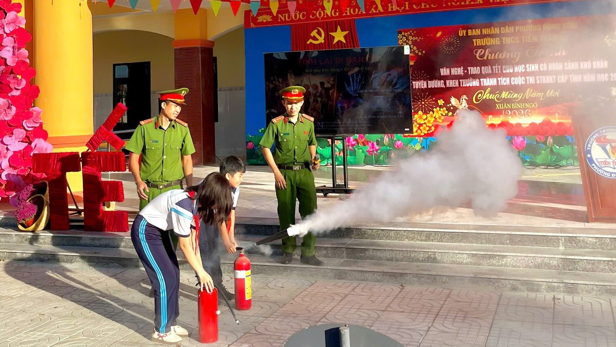Công an phường Đồng Xoài hướng dẫn học sinh kỹ năng sử dụng thiết bị phòng cháy chữa cháy