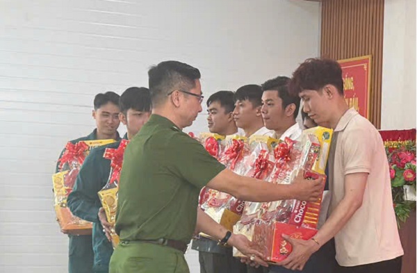 Đồng chí Trưởng Công an phường trao quyết định và tặng quà công dân thực hiện nghĩa vụ tham gia CAND