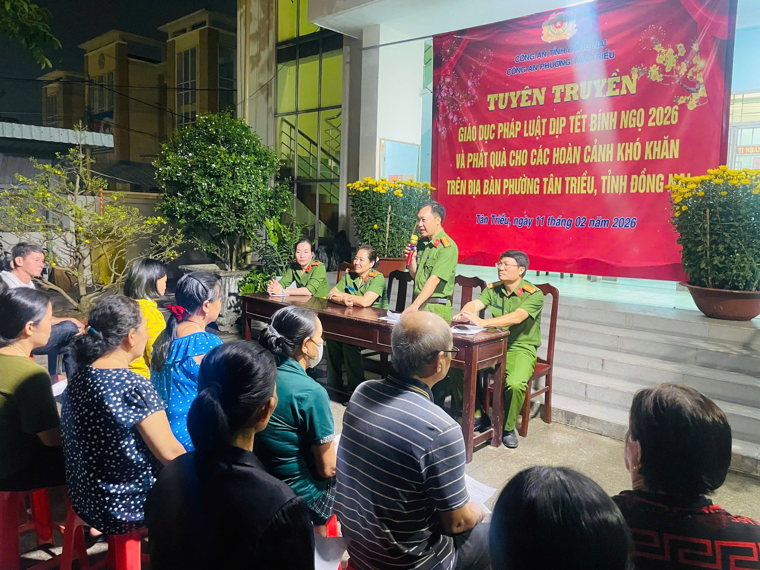 Trong không khí rộn ràng đón Xuân Bính Ngọ 2026, tối 11/02/2026, Công an phường Tân Triều tổ chức tuyên truyền, phổ biến pháp luật kết hợp trao quà Tết cho các hộ gia đình có hoàn cảnh khó khăn trên địa bàn.