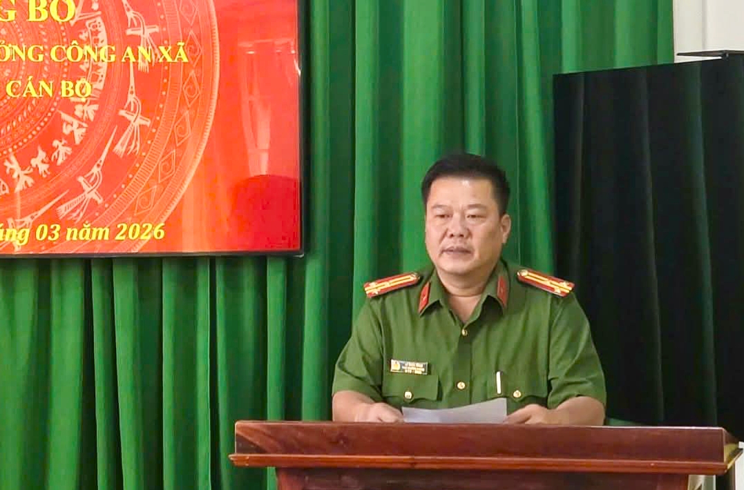 Đồng chí Trưởng Công an xã phát biểu chúc mừng và giao nhiệm vụ tại buổi Lễ