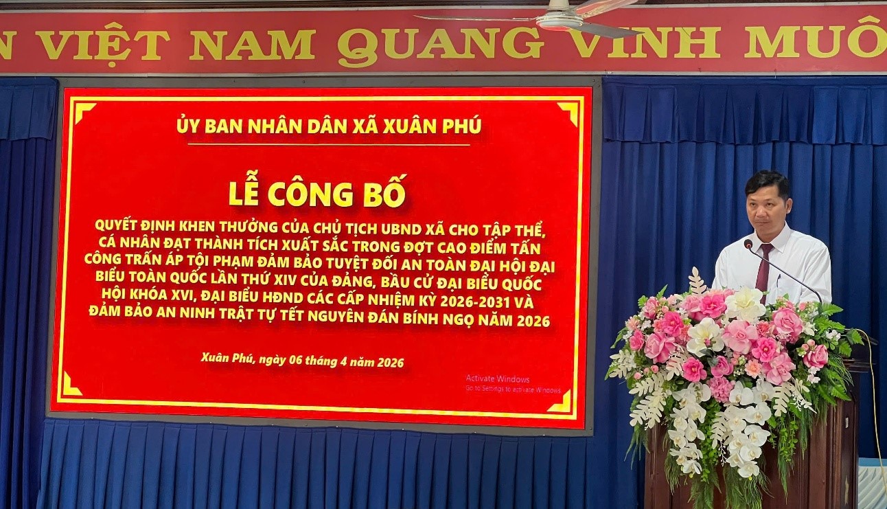 Sáng ngày 06/4/2026, UBND xã Xuân Phú, tỉnh Đồng Nai đã tổ chức Lễ công bố quyết định khen thưởng đột xuất cho tập thể Công an xã và 08 cá nhân có thành tích xuất sắc trong đợt cao điểm tấn công trấn áp tội phạm đảm bảo tuyệt đối an toàn Đại hội đại biểu toàn quốc lần thứ XIV của Đảng, bầu cử đại biểu Quốc hội khóa XVI, đaị biểu HĐND các cấp nhiệm kỳ 2026-2031 và đảm bảo an ninh trật tự Tết nguyên đán Bính Ngọ năm 2026.
