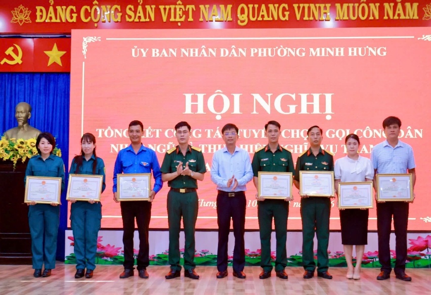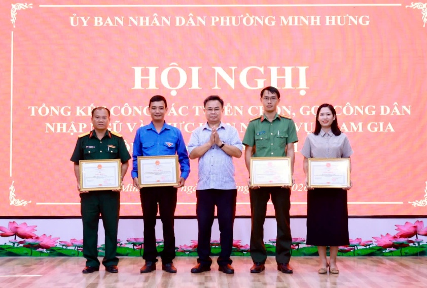 Dịp này, UBND phường Minh Hưng đã khen thưởng 4 tập thể, 8 cá nhân có thành tích xuất sắc trong công tác tuyển chọn, gọi công dân nhập ngũ và thực hiện nghĩa vụ tham gia CAND năm 2026.