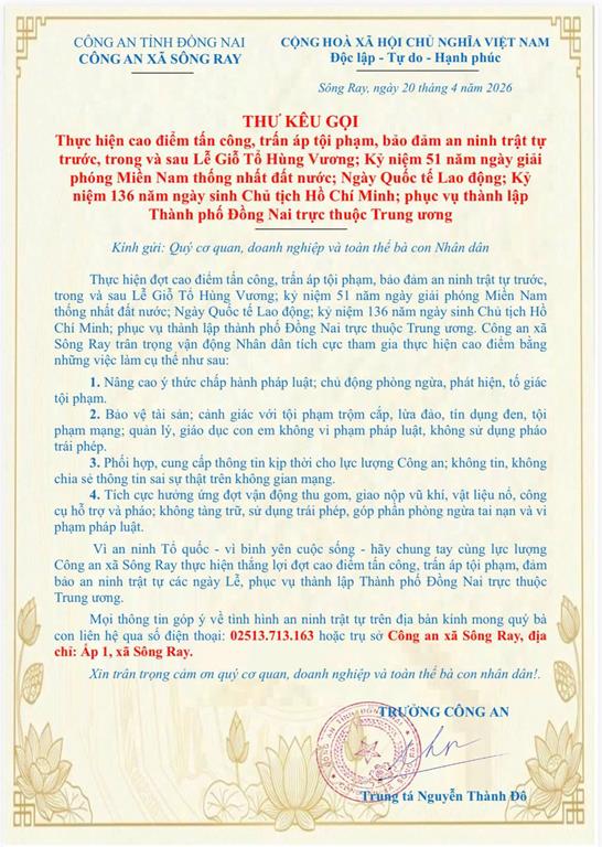 Theo đó, Công an xã Sông Ray kêu gọi người dân nâng cao ý thức chấp hành pháp luật, chủ động phòng ngừa, phát hiện và tố giác tội phạm. Tăng cường bảo vệ tài sản, cảnh giác với các loại tội phạm như trộm cắp, lừa đảo, tín dụng đen, tội phạm mạng; đồng thời quản lý, giáo dục con em không vi phạm pháp luật, không sử dụng pháo trái phép. Phối hợp chặt chẽ với lực lượng Công an, cung cấp thông tin kịp thời; không đăng tải, chia sẻ thông tin sai sự thật trên không gian mạng. Tích cực tham gia vận động thu gom, giao nộp vũ khí, vật liệu nổ, công cụ hỗ trợ và pháo, không tàng trữ, sử dụng trái phép, góp phần phòng ngừa tai nạn và vi phạm pháp luật.