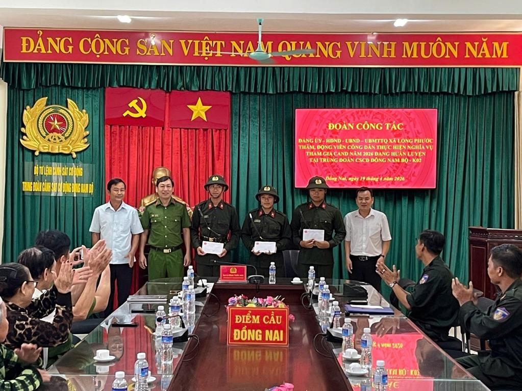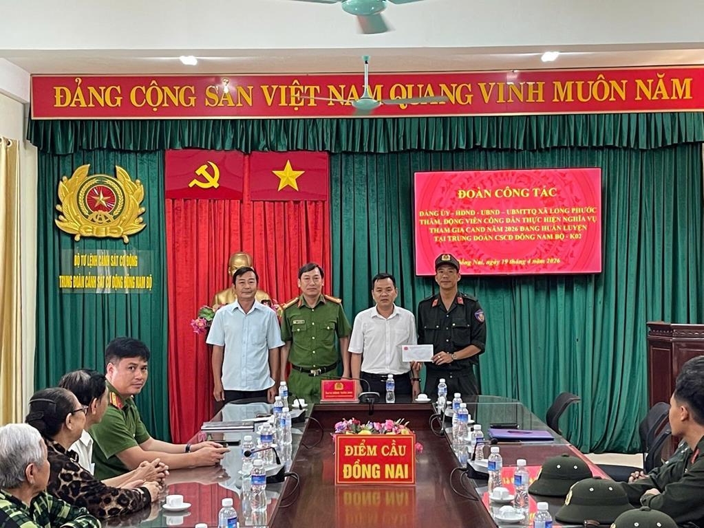 Tại đây, Đoàn đã có buổi gặp gỡ thân tình cùng đại diện lãnh đạo, chỉ huy 02 Trung đoàn và 07 tân binh của địa phương đang thực hiện nghĩa vụ quân sự tại đơn vị. Thay mặt chính quyền xã Long Phước, Đoàn công tác đã ân cần thăm hỏi về tình hình học tập, huấn luyện, đời sống sinh hoạt của các chiến sĩ mới, ghi nhận và biểu dương tinh thần nỗ lực, ý chí rèn luyện của các chiến sĩ trong thời gian đầu nhập ngũ; đồng thời động viên các chiến sĩ tiếp tục chấp hành nghiêm kỷ luật, tích cực học tập, rèn luyện, hoàn thành xuất sắc nhiệm vụ được giao.