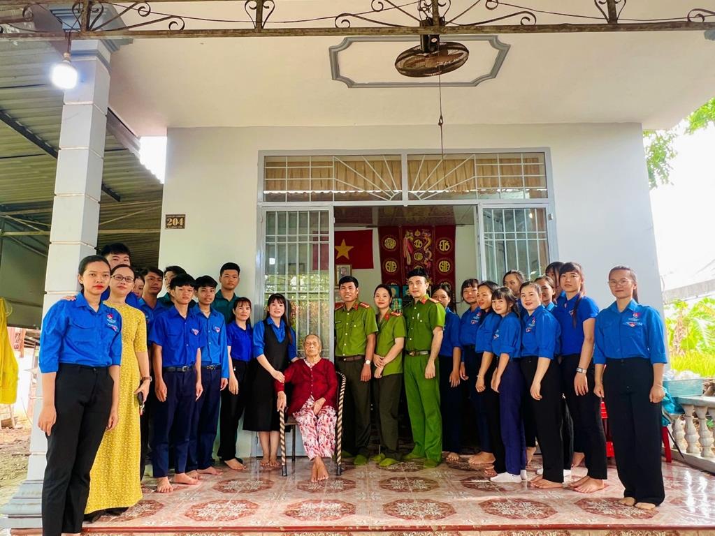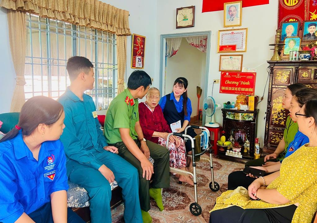 Đại diện Ban Chỉ huy, CBCS Công an xã cùng Đoàn thanh niên xã thăm hỏi, tặng quà Mẹ Việt Nam anh hùng Đỗ Thị Miên tại ấp Bình Tân, xã Xuân Phú