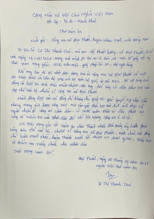 Thư cảm ơn của chị Lê Thị Thanh Trúc gửi Công an xã Đại Phước