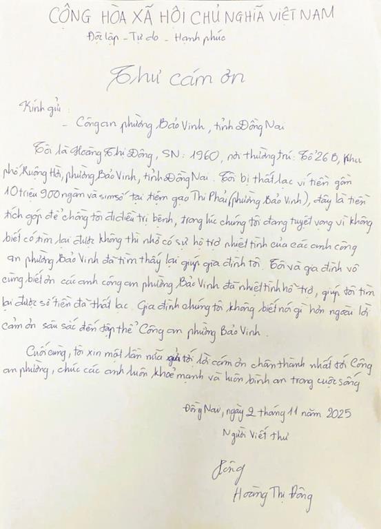 Bà Hoàng Thị Đông gửi thư cám ơn Công an phường Bảo Vinh
