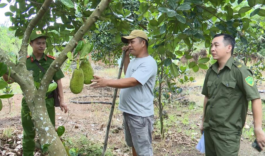 Cảnh sát khu vực Công an xã Hưng Thịnh cùng Lực lượng ANTT ở cơ sở tham quan vườn trồng cây ăn trái của gia đình anh Nguyễn Tấn Phương (đứng giữa)